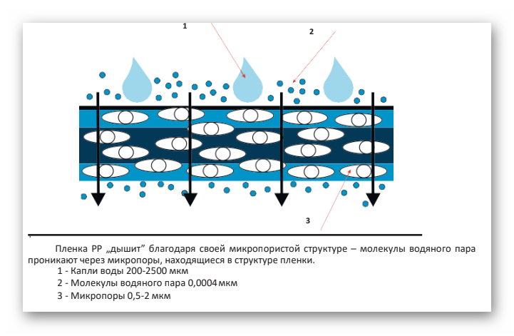 В мембранах Geobond используется только трехслойная функциональная полипропиленовая плёнка РР . Такая плёнка характеризуется очень высокими паропропускными параметрами – Sd в диапазоне от 0 до 0,04 [м]. За диффузию водяного пара отвечают микропоры с диаметром в сотни раз меньше капли воды, образовавшиеся в процессе производства пленки РР при экструзии с добавлением мела. Микропористая пленка РР - одновременно и водонепроницаемая, и паропропускная. Обладает высокой устойчивостью к УФ излучению.